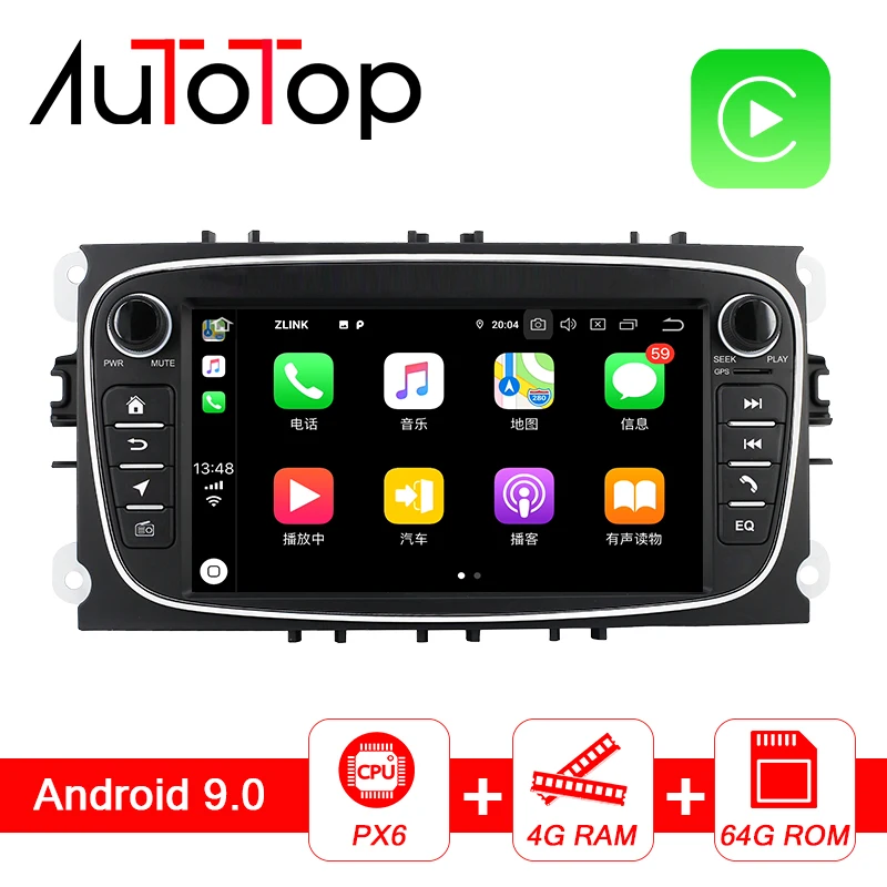 CPU1.Processor: Rockchip PX6, 6-Core(Dual-core cortex A72 @ 1.8G, Quad-core cortex A53 @ 1.5G) , 64-Bits , Android 9.0 OS2.Radio IC: NXP7786 , Amplifier IC: TDA7851.3. RAM 4G ROM 64G Fits for:Ford Focus II 2008-2011 Ford Mendeo 9 2008-2011Ford S-Max 2008-2011Ford C-Max 2008-2011Ford Galaxy II 2006-2011 Ford Kuga 2006-2011 CarPlayCarPlay is a smarter,safer way to use your Iphone in the car. DSPSupport DSP (Digital Singal Processing Sound System): 15 band real EQ selection , 4 sound effect adjustment. Steering Wheel ControlSupport original car steering wheel control GPS NavigationIGO map & Navitel map ( Russian ,Ukraine,Belarus,Kazakhstan) built-in device, support Google online maps. Bluetooth & Radio1.Build-in bluetooth , support handsfree calling , display phone book.2..AM/FM radio with RDS functions.3.Support mirror link , car logo setting and OSD languages ( English , Russian , Spainish ......) Optional AccessoriesSupport DVR , rear view camera, OBD2 , TPMS , DVB-T2, DAB+, 4G modem (HUAWEI E3372) Warranty & ServiceGentle Remind: When ship by DHL , some times you need to pay the remote fee , please kindly check the remote area zip code from this link.//www.dhl.com/content/dam/downloads/g0/express/services/surcharges/dhl_express_remote_areas.pdf